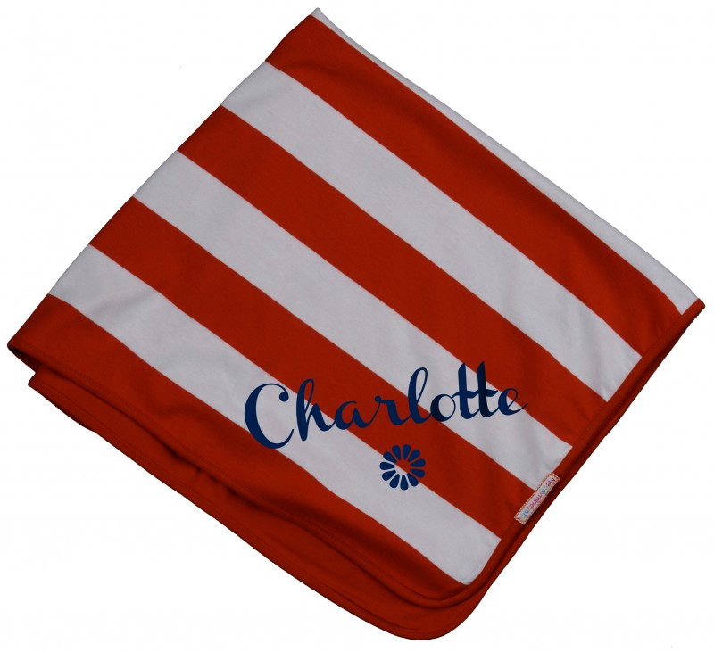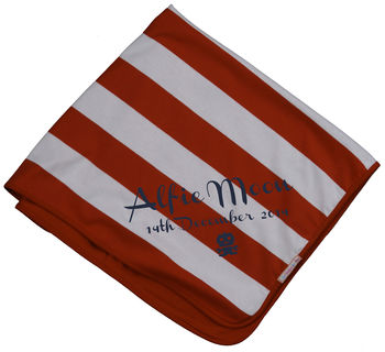 A bright, contemporary striped baby blanket by Meenymineymo that can be personalised with baby’s name or a fun and personal message.