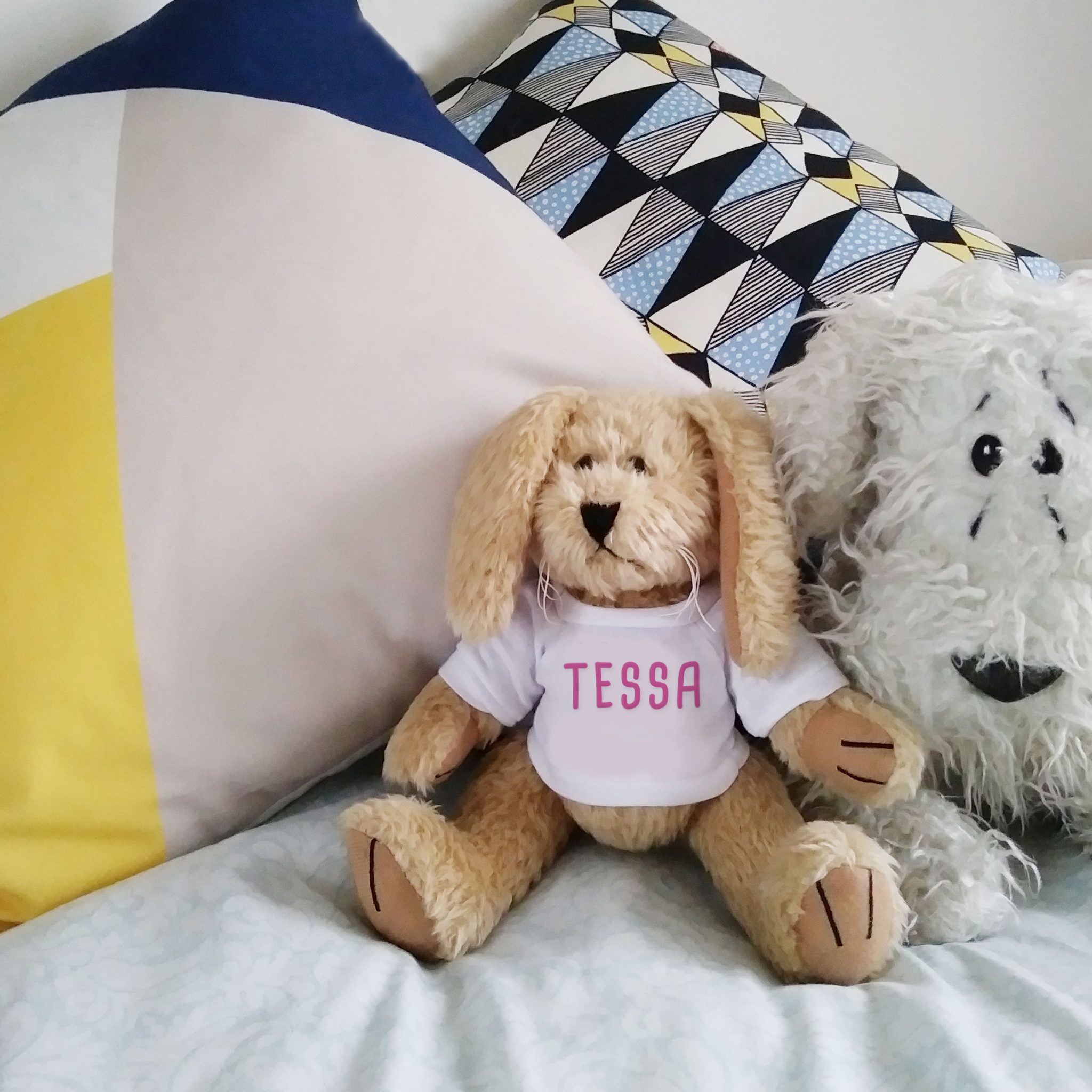 Treat your favourite small person to this gorgeous lop-eared bunny toy! With moveable arms and legs and lovely soft fur, he comes wearing a white tee that you can personalise with our choice of quotes or one of your own, or even a name. Pressed on by hand in a lovely velvety flocking, choose from Pink, Blue or Grey lettering on the tee.