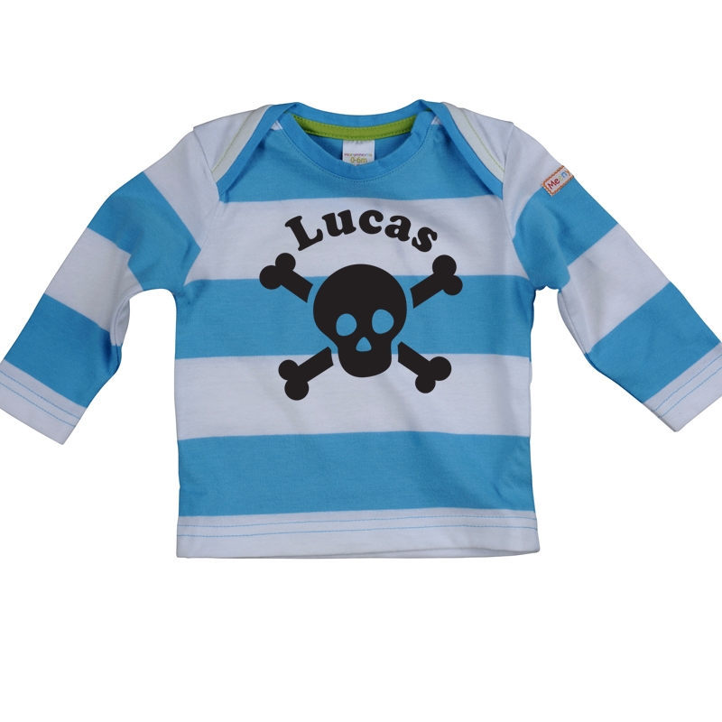 Ahoy there me heartys! Pirates of the Caribbean fans – this ones for you! This long sleeve personalised tee is gorgeously soft fresh bright and very cool! Makes a fabulously unique gift for one lucky tot. Choose from blue and white or red and white stripe with black graphics.